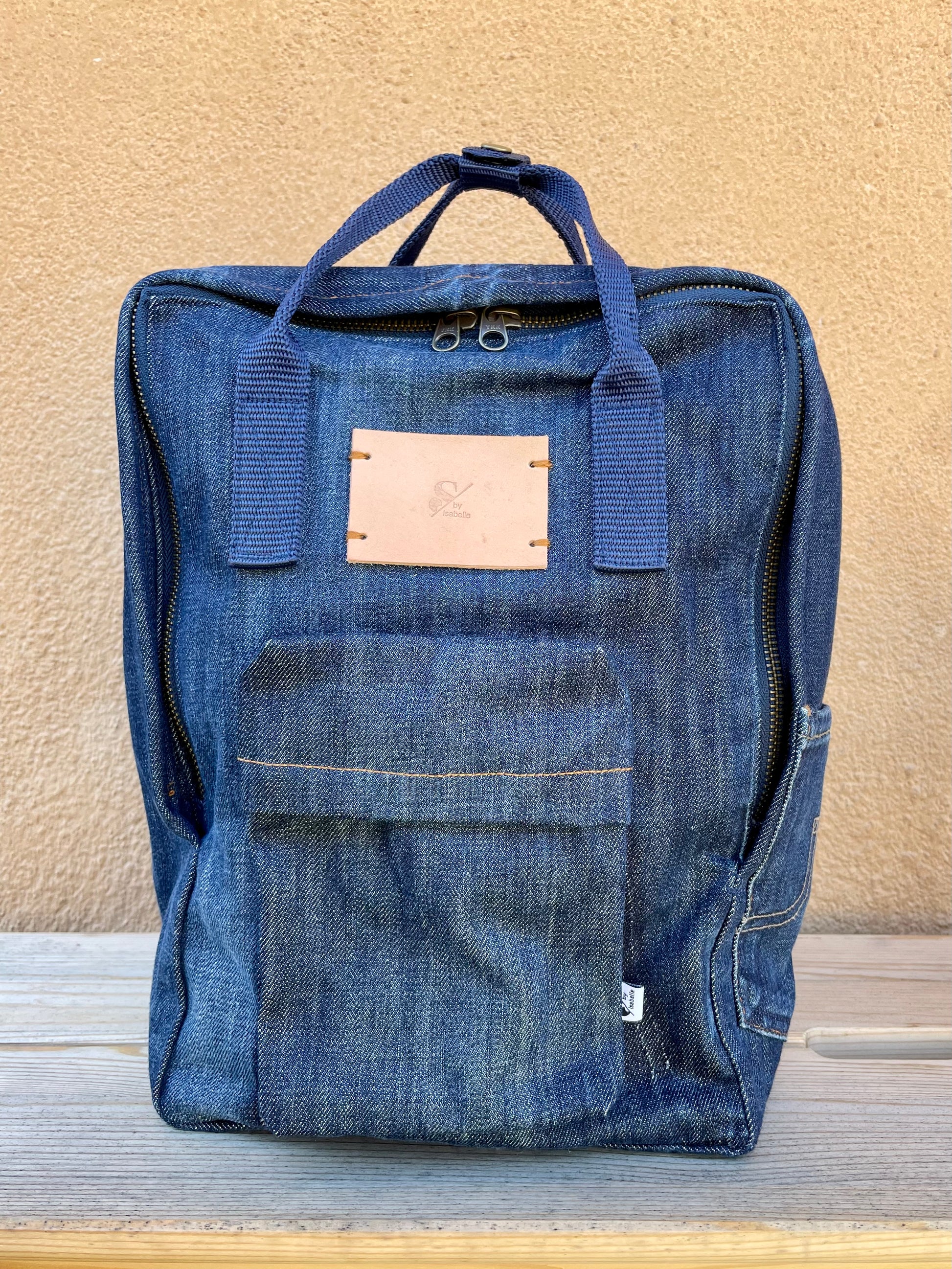 Handmade denim backpack in the style of Fjällräven Kånken. Made from upcycled jeans.